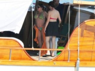 Aksu merdivenlere inen asistanının yardımıyla denizin içinde bordo elbisesini çıkarttı ve getirilen bornozu giyip sudan çıktı. Yukarı çıkarken kahkahalar atan Aksu gazetecilerin gittiğini zannedip üzerinden bornozunu çıkartınca sarı bikinisiyle görüntülendi. 'Kayıkçı teknesindeki gazeteciler gitti' diye Aksu'yu uyaran arkadaşları bir anda karadaki gazetecileri görünce şoke oldu. Sonrasında ellerine aldıkları dürbünle gazetecileri kontrol eden personel, muhabirlerin uzaklaşmasıyla derin bir nefes aldı.