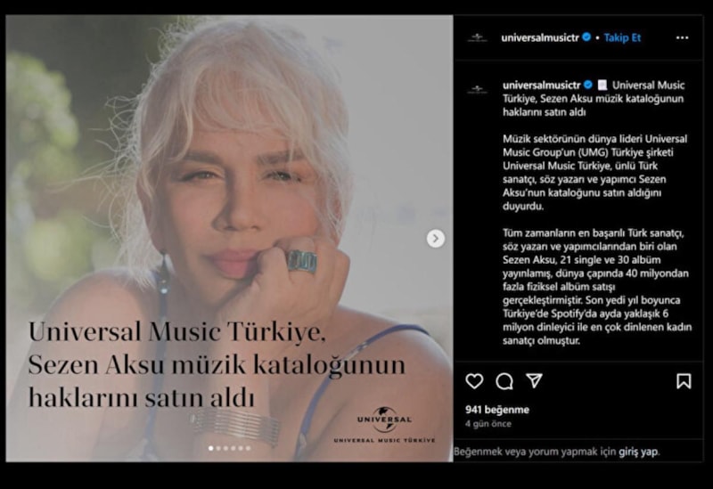 Universal Music Group, Türk müziğinin "Minik Serçe'si" olarak anılan Sezen Aksu'nun şarkı haklarını 700 milyon liraya satın aldı. Ancak Aksu'nun şarkı haklarını satın alan şirketin sahibinin İsrail destekçisi olduğu ortaya çıktı.