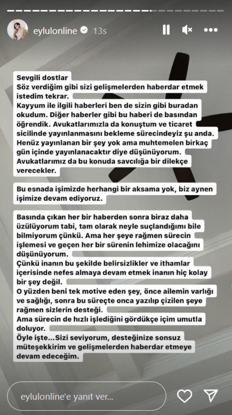 Eylül Öztürk, "Söz verdiğim gibi sizi gelişmelerden haberdar etmek istedim tekrar. Kayyum ile ilgili haberleri ben de sizin gibi buradan okudum. Diğer haberler gibi bu haberi de basından öğrendik. Avukatlarımızla da konuştum ve ticaret sicilinde yayınlanmasını bekleme sürecindeyiz şu anda.