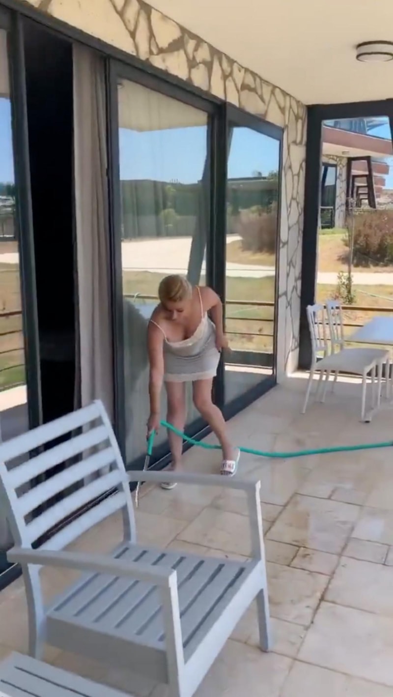 Hortumu eline alan Songül Karlı'nın son olarak yazlığında balkonu yıkadığı anlar dikkat çekti. Sosyal medyada paylaşılan o anlarda Karlı'nın gecelikle olduğu da gözlerden kaçmadı