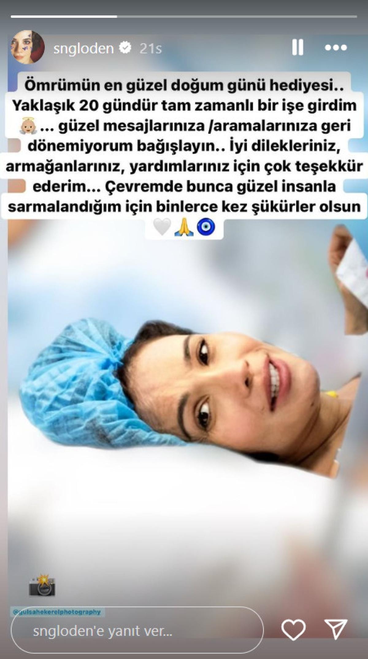 Öden paylaşımına, "Ömrümün en güzel doğum günü hediyesi...Yaklaşık 20 gündür tam zamanlı bir işe girdim. Güzel mesajlarınıza/aramalarına dönemiyorum bağışlayın.
