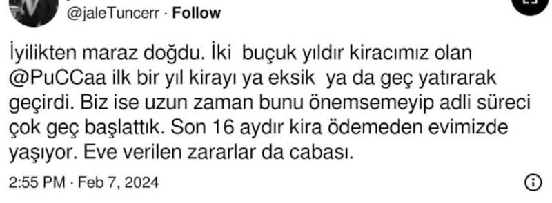 İki buçuk yıldır Pucca'nın kendi evinde kiracı olarak oturduğunu söyleyen Jale Tuncer, "İyilikten maraz doğdu" diyerek Pucca'nın, ilk bir yıl kirayı eksik veya geç yatırdığını, 16 aydır da kira ödemediğini ve eve zarar verdiğini iddia etti.