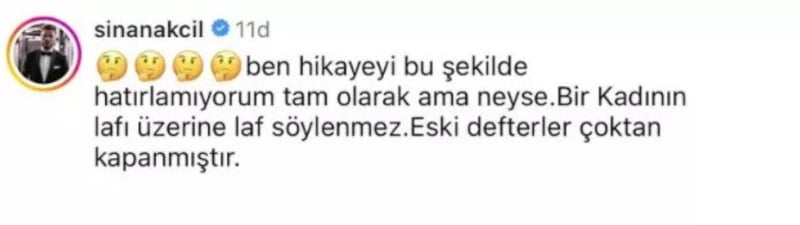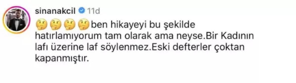 Hadise'nin açıklamalarının ardından anlatılan kişinin kendisi olduğu iddia edilen Sinan Akçıl, "Ben hikayeyi bu şekilde hatırlamıyorum tam olarak ama neyse. Bir kadının lafı üzerine laf söylenmez. Eski defterler çoktan kapanmıştır." ifadelerini kullanmıştı.