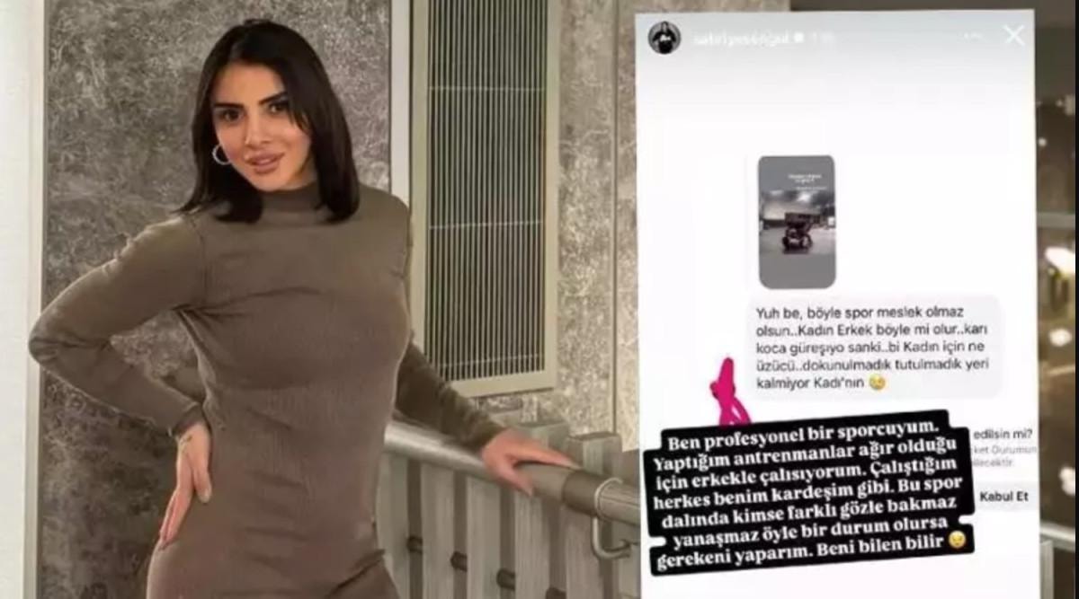 Sabriye Şengül takipçisinden gelen ''Yuh be böyle spor, meslek olmaz olsun. Kadın erkek böyle mi olur? Karı koca güreşiyor sanki. Bir kadın için ne üzücü. Dokunulmadık, tutulmadık yeri kalmıyor kadının'' sözlerine; ''Ben profesyonel bir sporcuyum. Yaptığım antrenmanlar ağır olduğu için erkekle çalışıyorum. Çalıştığım herkes benim için kardeşim gibi. Bu spor dalında kimse farklı gözle bakmaz, yanaşmaz. Öyle bir durum olursa gerekeni yaparım. Beni bilen bilir.'' yanıtını verdi.