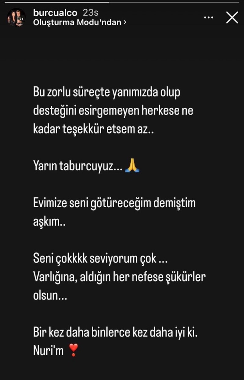 Burcu Alço, sosyal medyadan yaptığı paylaşımında “Bu zorlu süreçte yanımızda olup desteğini esirgemeyen herkese ne kadar teşekkür etsem az. Seni çok seviyorum, varlığına, aldığın her nefese şükürler olsun. Bir kez daha binlerce kez daha iyi ki Nuri’m.” diye yazdı.