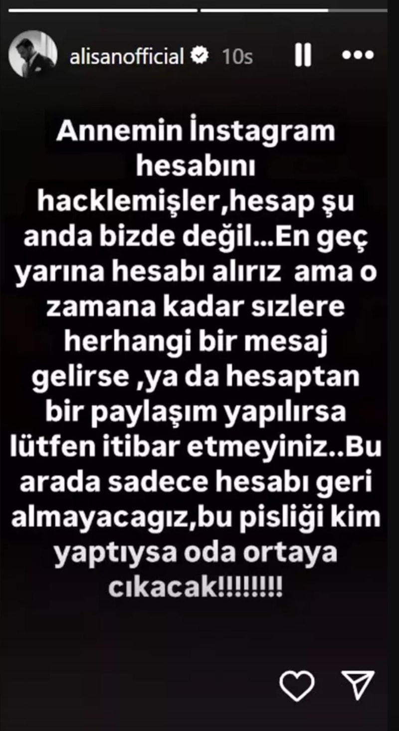 "Annemin Instagram hesabını hacklemişler, hesap şu anda bizde değil... En genç yarına hesabı alırız ama o zamana kadar sizlere herhangi bir mesaj gelirse ya da hesaptan bir paylaşım yapılırsa lütfen itibar etmeyiniz...