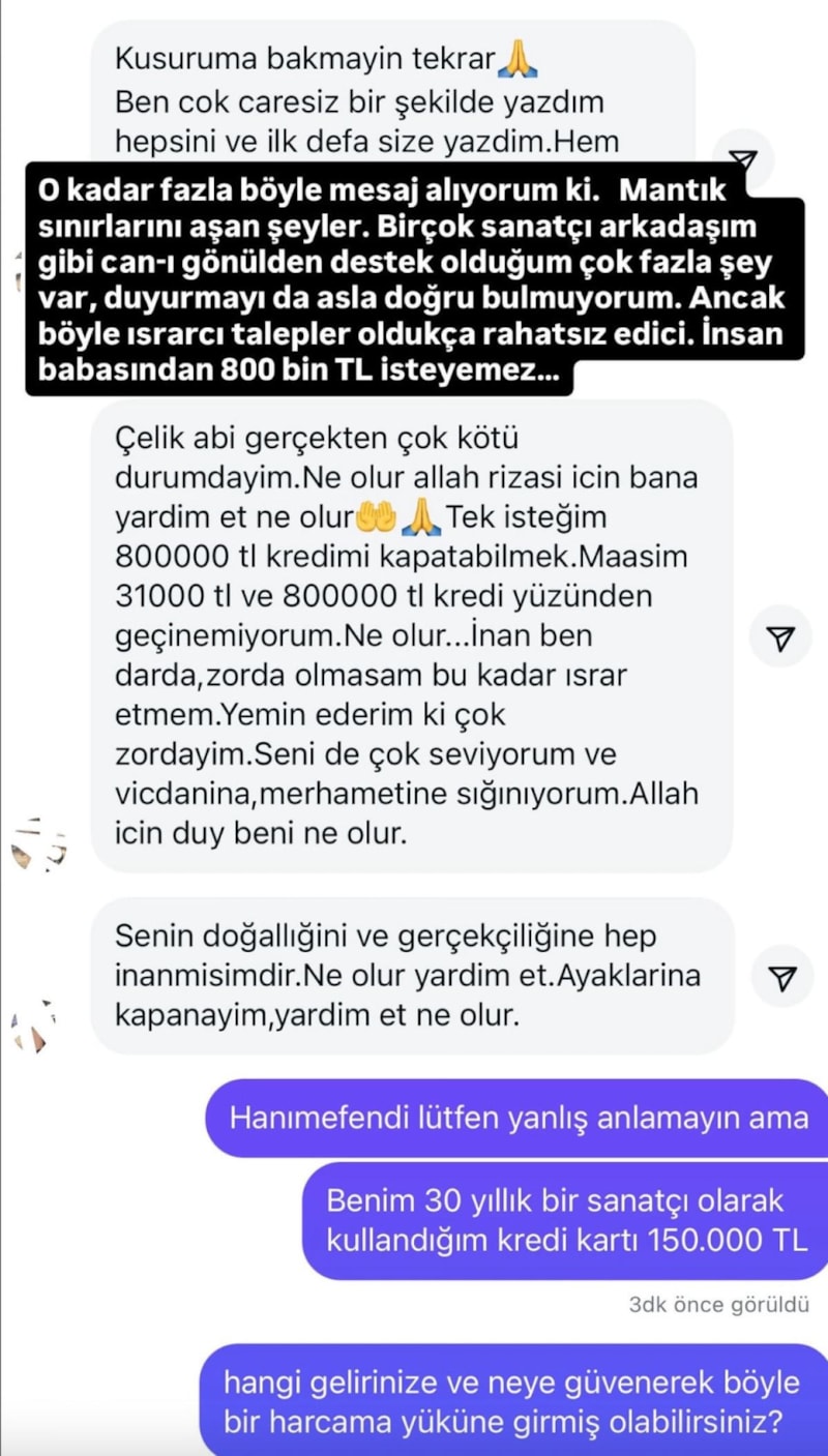 Ünlü şarkıcı Çelik, kendisinden 800 bin TL isteyen takipçisinin mesajlarını yayınladı. Ünlü ismin paylaşımı sosyal medyada konuşuldu.