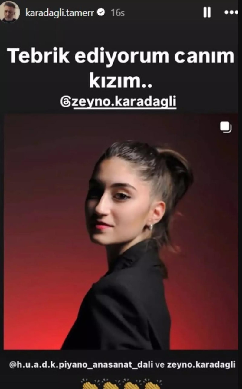 Hacettepe Üniversitesi Konservatuvar öğrencisi olan Zeyno Karadağlı'yı babası, sosyal medya hesabından yaptığı bir paylaşımla tebrik etti. Kızının fotoğrafını paylaşan Karadağlı, "Tebrik ediyorum canım kızım. Yolun hep açık başarıların her daim senle olsun" dedi.