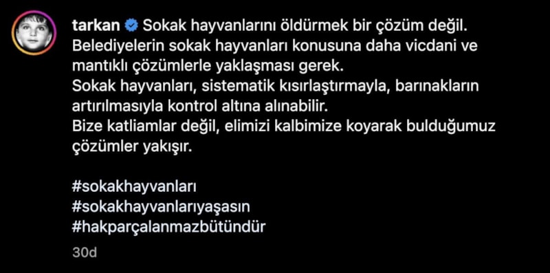 Ünlü şarkıcı Tarkan, sosyal medya hesabından yaptığı açıklamasında "Sokak hayvanlarını öldürmek bir çözüm değil. Belediyelerin sokak hayvanları konusuna daha vicdani ve mantıklı çözümlerle yaklaşması gerek" dedi.