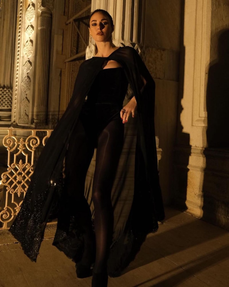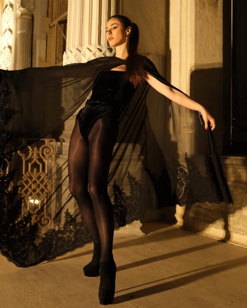 Samyeli'nin son paylaşımı ise külotlu çorap- body akımını sevdiğini gösterdi. Siyahlar içerisine bürünen ünlü güzel, peleriniyle de kombinine hava kattı.