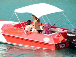 Çift, önceki gün bir sürat teknesi ile koyları dolaşırken objektife yansıdı. Bu arada en dikkat çeken detay, Kümeli'nin bikinisinin kendine bir beden küçük olduğuydu.