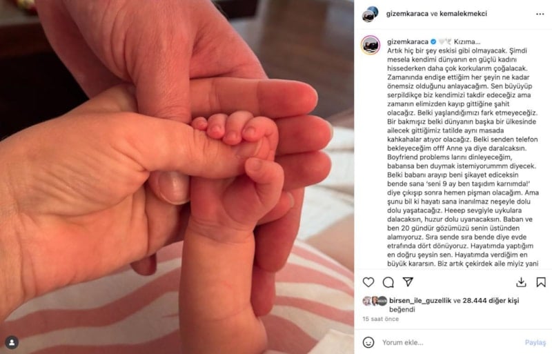 Hep sevgiyle uykulara dalacaksın, huzur dolu uyanacaksın. Baban ve ben 20 gündür gözümüzü senin üstünden alamıyoruz. Sıra sende, sıra bende diye evde etrafında dört dönüyoruz. Hayatımda yaptığım en doğru şeysin sen. Hayatımda verdiğim en büyük kararsın. Biz artık çekirdek aile miyiz yani diye ara sıra Kemal'e soruyorum. 20 gün önce hastaneye koştura koştura gittiğimizi hiç unutmayacağım. Bize 3 gün önceden yanlış alarmlar verip bu şakacı halini de hiç unutmayacağım. Artık hiçbir şey eskisi gibi olmayacak, çünkü birlikte büyüyeceğiz bir tanem. Sen bana, ben sana öğretmen olacağız. Çok şükür çok... Seni çok seviyoruz Yaz. İyi ki geldin.''