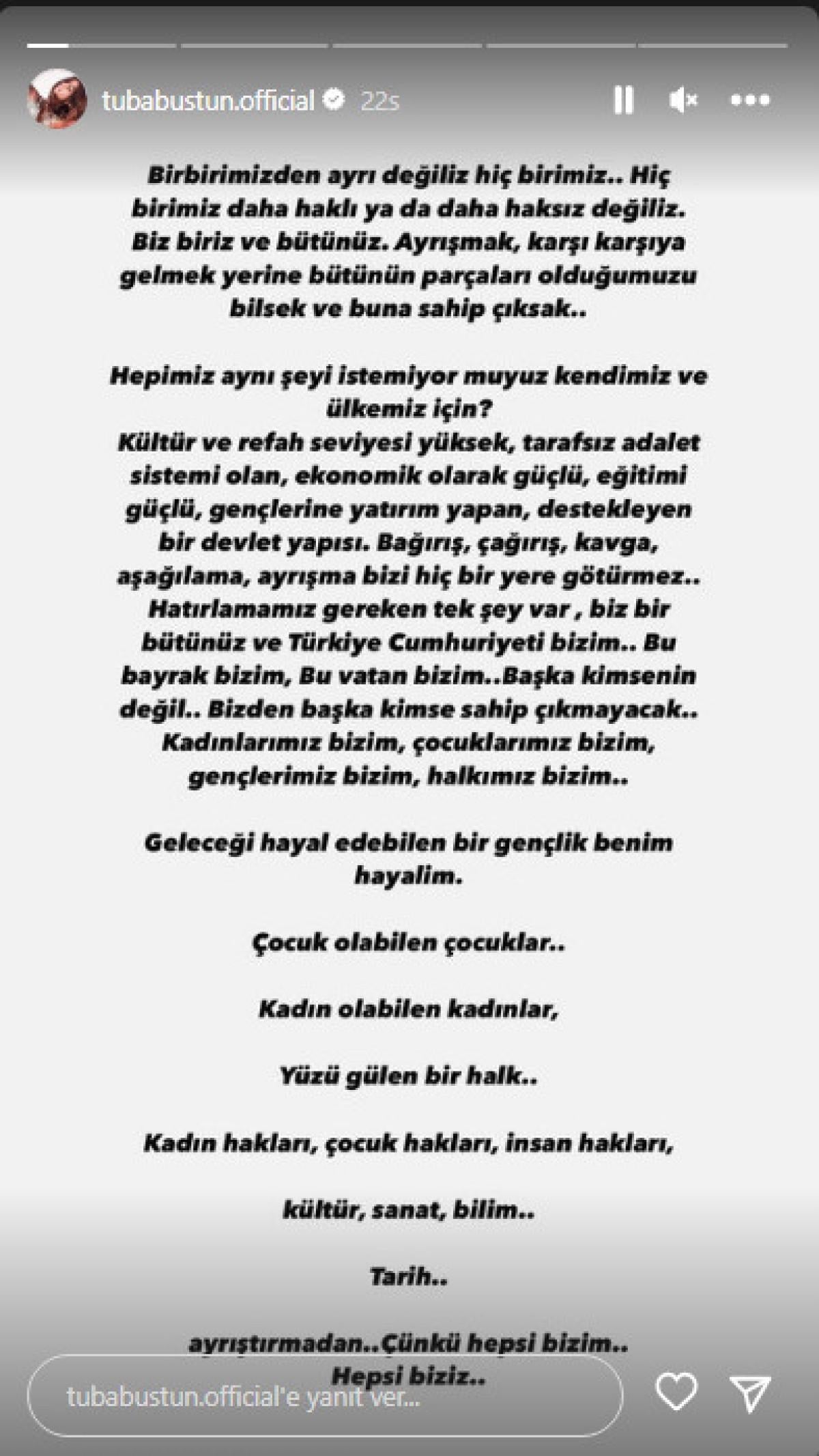"Birbirimizden ayrı değiliz hiçbirimiz" diyen Tuba Büyüküstün paylaşımında "Ayrışmak karşı karşıya gelmek yerine bütünün parçaları olduğumuzu bilsek ve buna sahip çıksak... Hepimiz aynı şeyi istemiyor muyuz kendimiz ve ülkemiz için?" diye sordu.