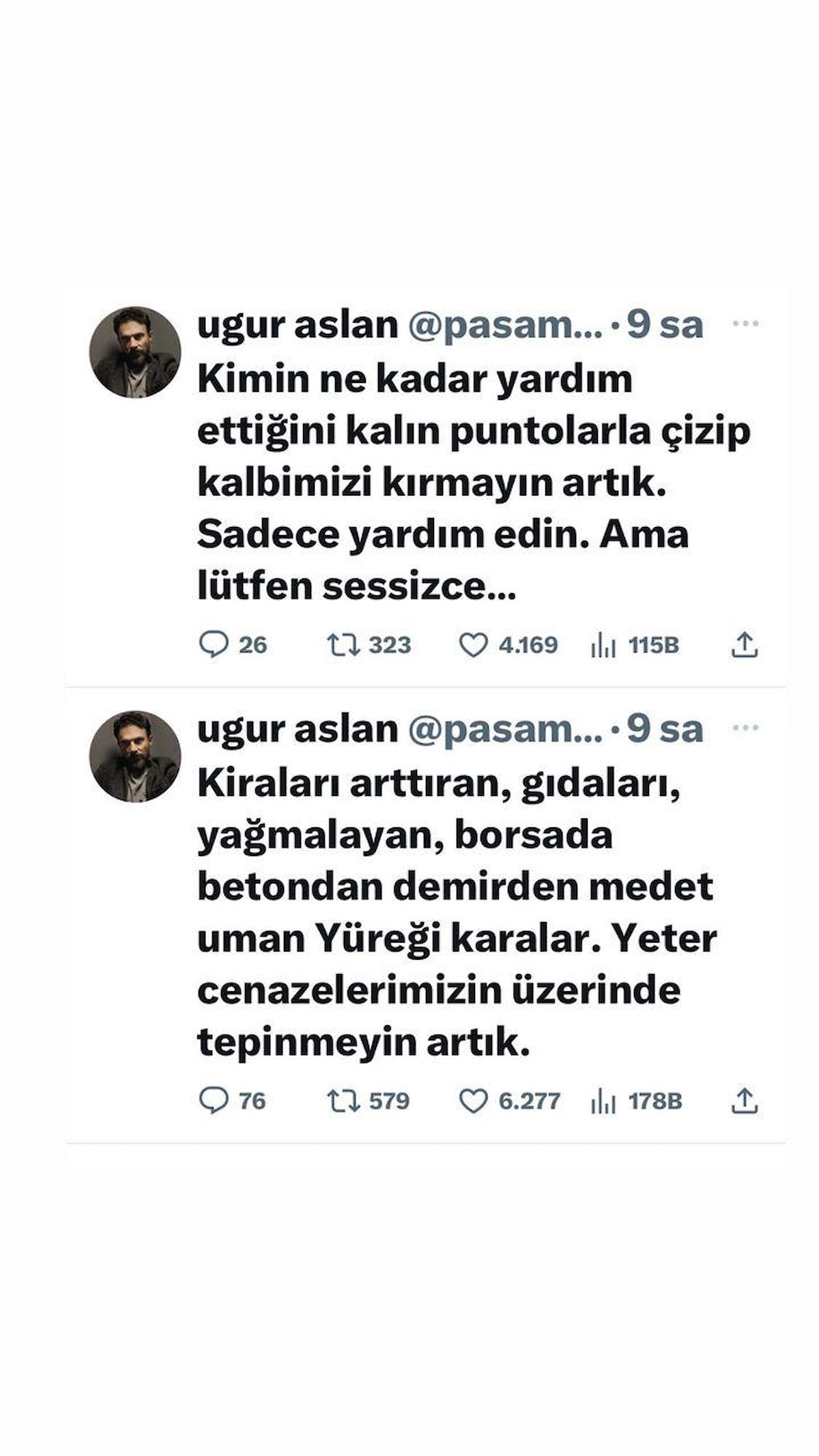 "Kimin ne kadar yardım ettiğini kalın puntolarla çizip kalbimizi kırmayın artık. Sadece yardım edin. Ama lütfen sessizce... Kiraları artıran, gıdaları yağmalayan, borsada betondan demirden medet uman yüreği karalar. Yeter cenazelerimizin üzerinde tepinmeyin artık."
