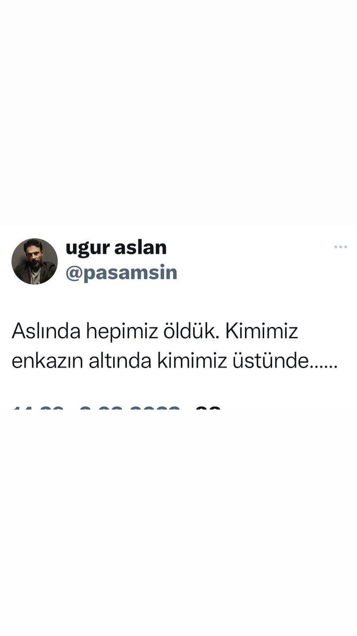 Aslan, paylaşımında "Aslında hepimiz öldük. Kimimiz enkazın altında, kimimiz üstünde" ifadelerini kullandı.