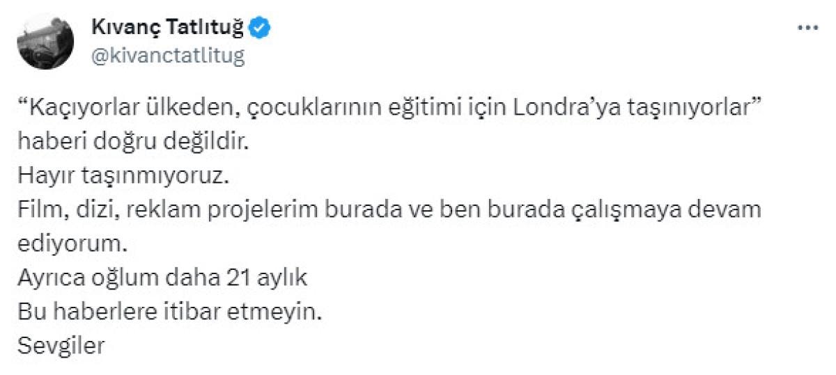 "'Kaçıyorlar ülkeden, çocuklarının eğitimi için Londra’ya taşınıyorlar' haberi doğru değildir. Hayır taşınmıyoruz. Film, dizi, reklam projelerim burada ve ben burada çalışmaya devam ediyorum. Ayrıca oğlum daha 21 aylık. Bu haberlere itibar etmeyin. Sevgiler."