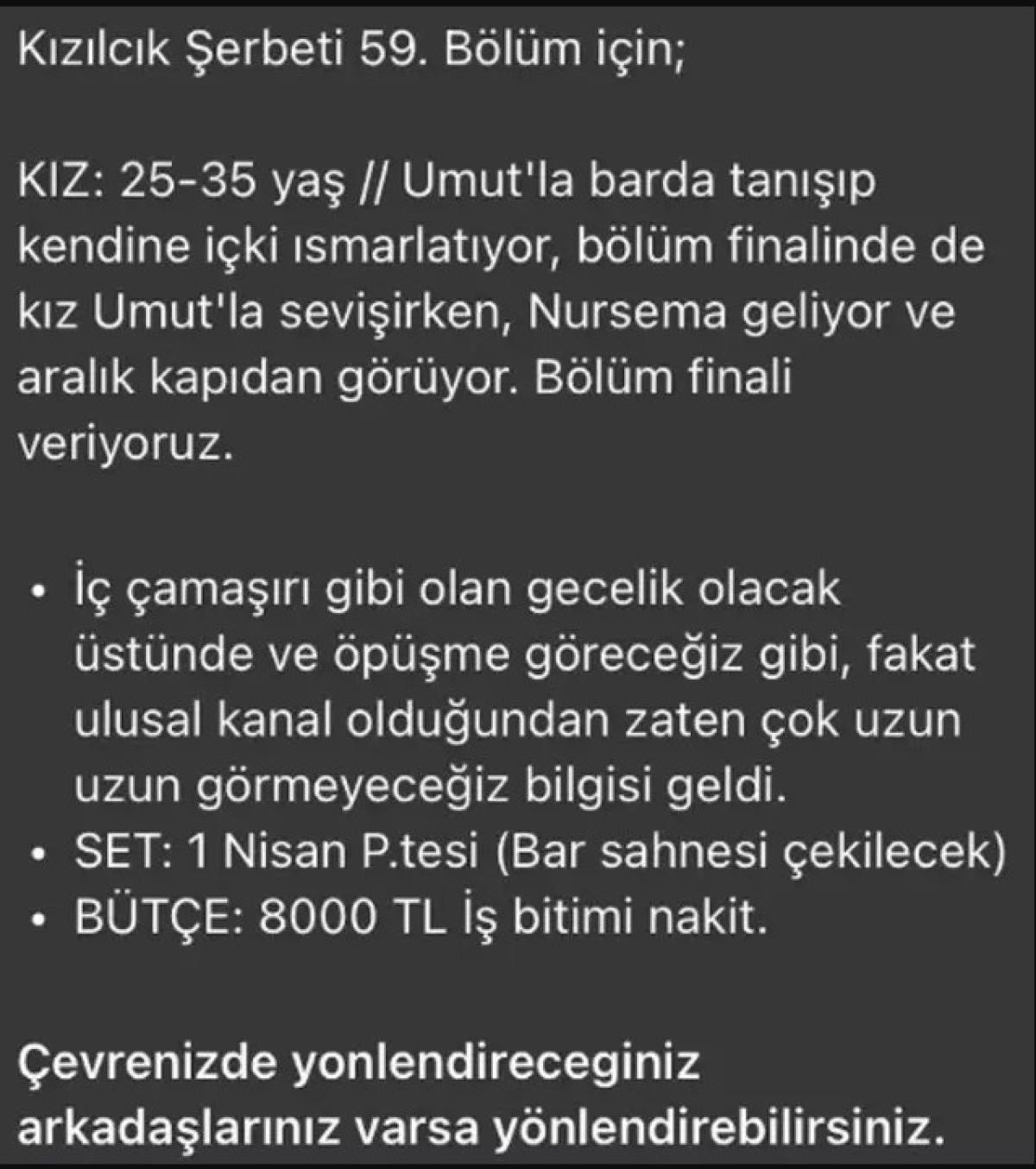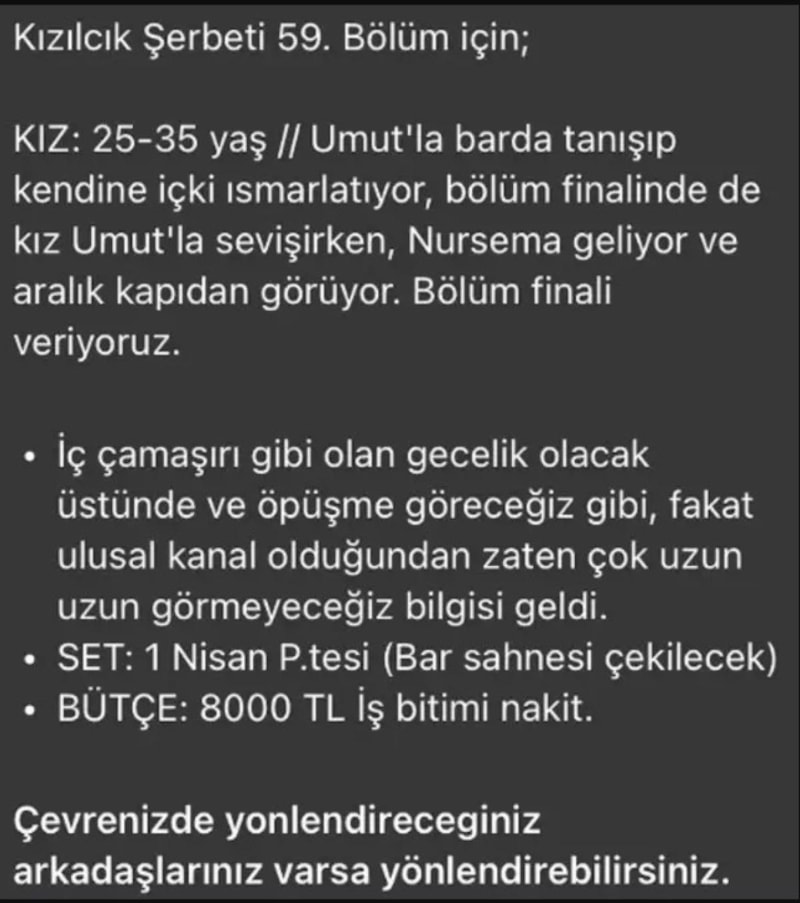 Bölüm finali veriyoruz. İç çamaşırı gibi olan gecelik olacak üstünde ve öpüşme göreceğiz gibi, fakat ulusal kanal olduğundan zaten çok uzun uzun göremeyeceğiz bilgisi geldi.' ifadelerine yer verildi.