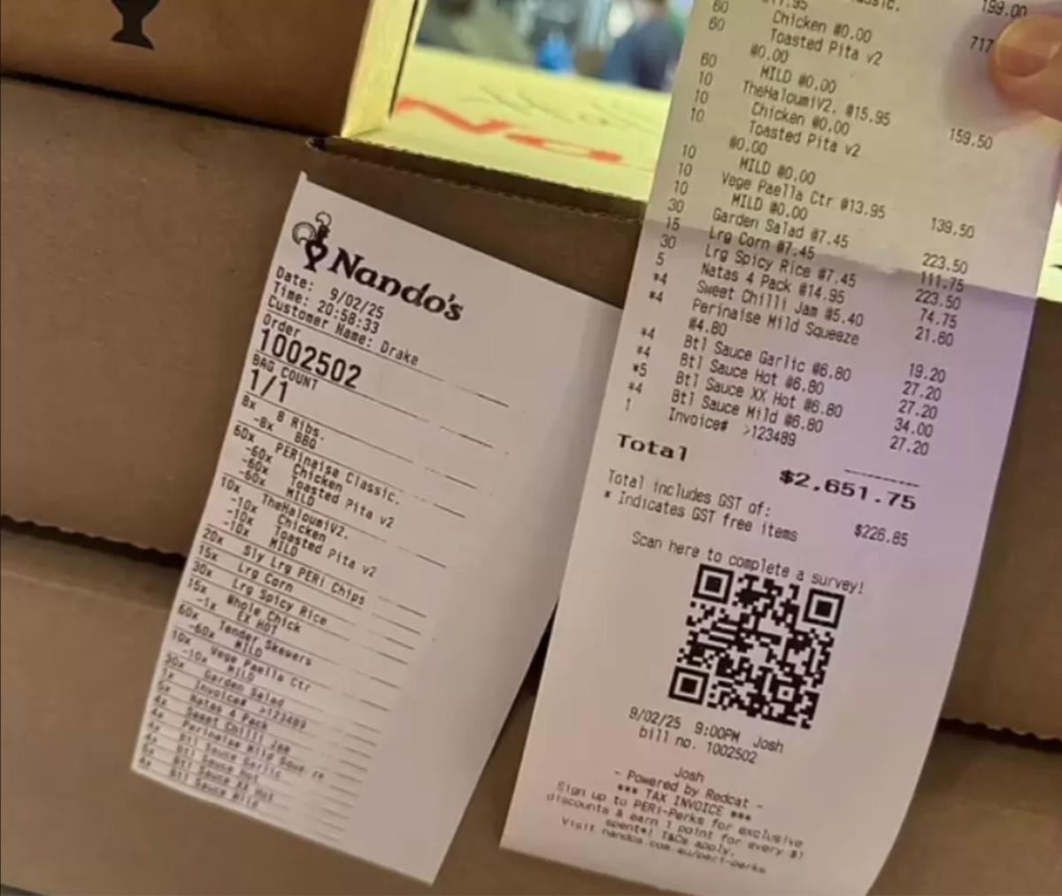 Drake, turnesinin Melbourne etabını 90 dakikalık unutulmaz bir performansla tamamladı. Konserin ardından, ünlü rapçi, ekibi ve davetlilerine tam 2 bin 651 dolarlık bir Nando's ziyafeti verdi.
