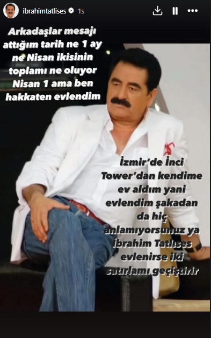 "Arkadaşlar mesajı paylaştığım tarih ne? 1. Ay ne? Nisan. İkisinin toplamı ne oluyor? Nisan 1. Ama ben hakikaten evlendim... İzmir'de kendime ev aldım, yani evlendim. Şakadan da hiç anlamıyorsunuz ya! İbrahim Tatlıses evlenirse iki satırla mı geçiştirir?"