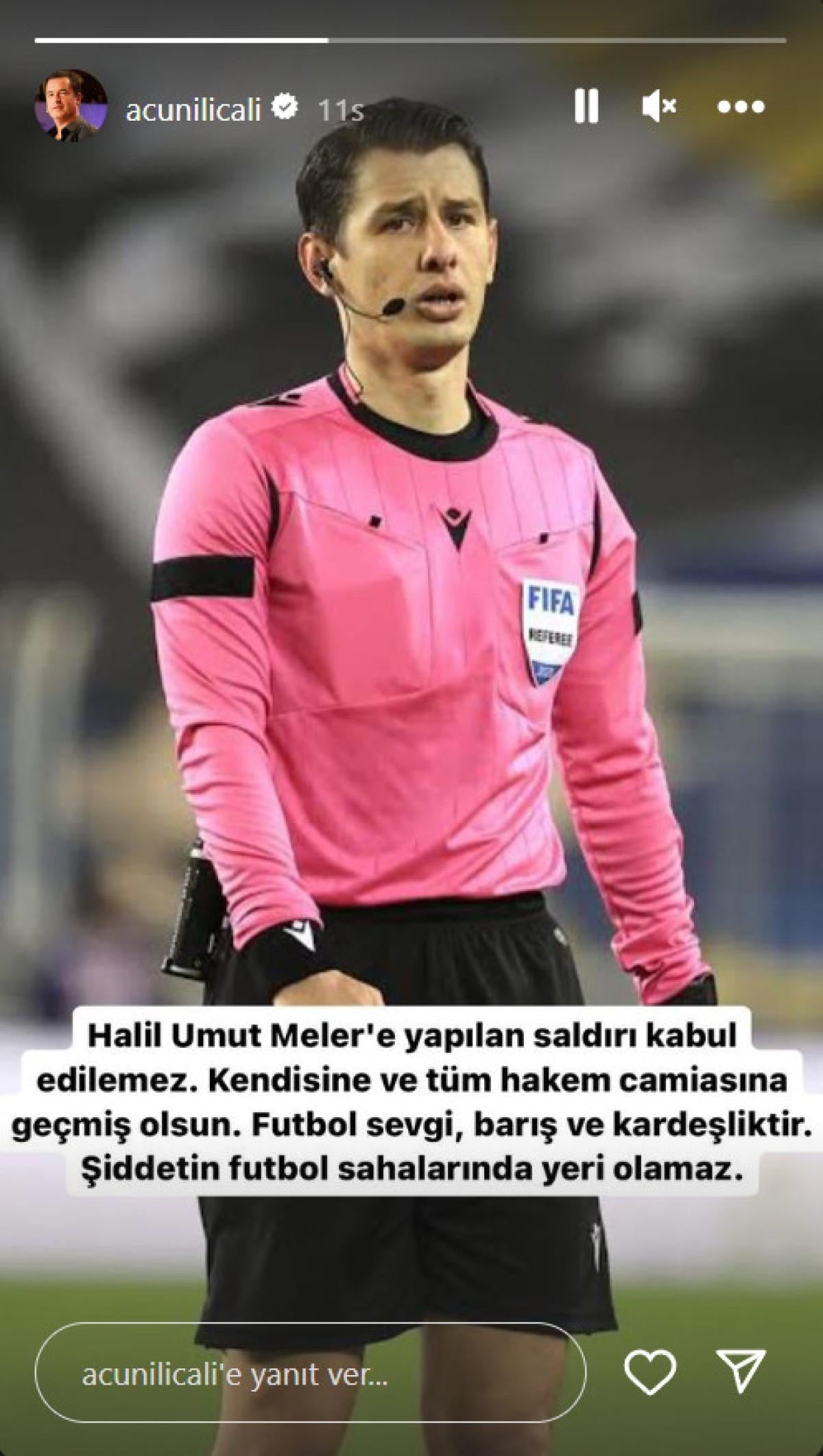 Halil Umut Meler'e yapılan saldırı kabul edilemez. Kendisine ve tüm hakem camiasına geçmiş olsun. Futbol sevgi, barış ve kardeşliktir. Şiddetin futbol sahalarında yeri olamaz.