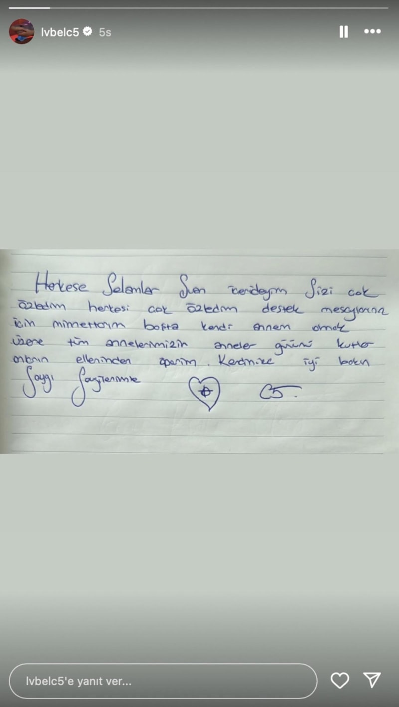 Lvbel C5 mektubunda, 'Herkese selamlar, şu an içerideyim. Sizi çok özledim, herkesi çok özledim. Destek mesajlarınız için minnettarım. Başta kendi annem olmak üzere tüm annelerimizin Anneler Günü'nü kutlar, onların ellerinden öperim. Kendinize iyi bakın, saygı ve sevgilerimle.' ifadelerini kullandı.