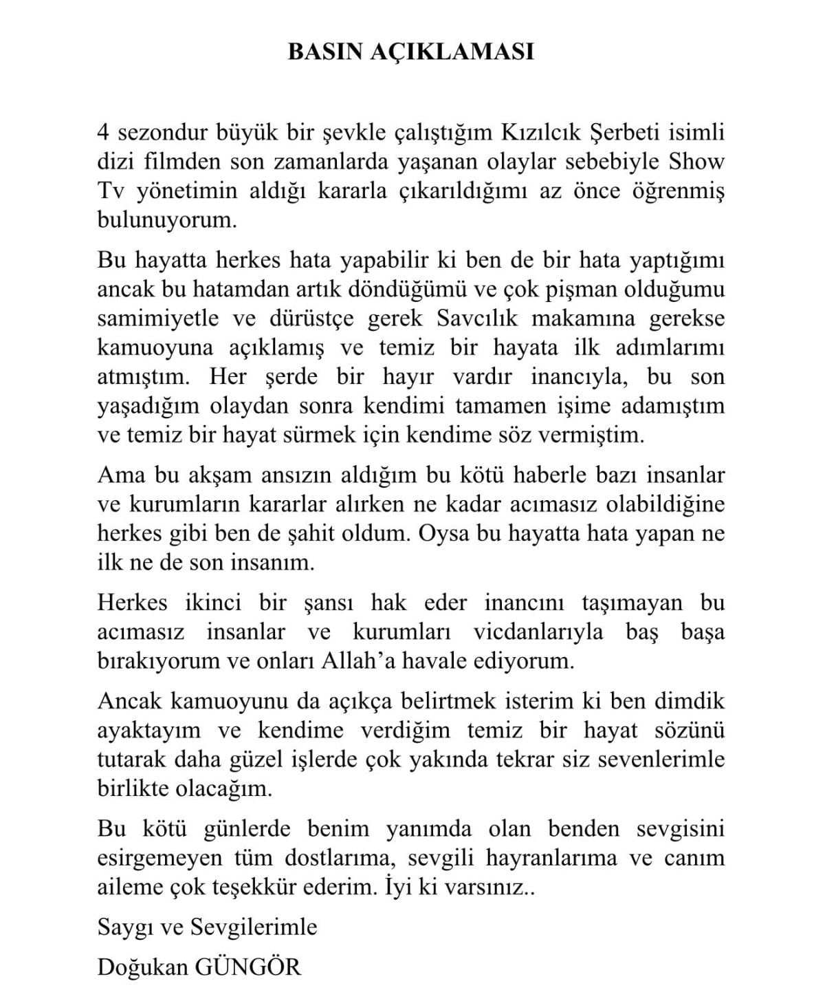 4 sezondur büyük bir şevkle çalıştığım Kızılcık Şerbeti isimli dizi filmden son zamanlarda yaşanan olaylar sebebiyle Show TV yönetiminin aldığı kararla çıkarıldığımı az önce öğrenmiş bulunuyorum.