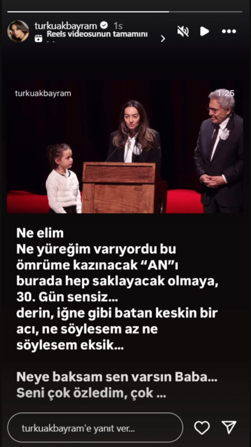 Ayrıca Türkü Akbayram, bu paylaşımını hikaye olarak da yayımlayıp şu notu düştü; "Ne elim, ne yüreğim varıyordu bu ömrüme kazınacak anı burada hep saklayacak olmaya. 30'uncu gün sensiz... Derin, iğne gibi batan keskin bir acı; ne söylesem az, ne söylesem eksik... Neye baksam sen varsın, baba... Seni çok özledim, çok"