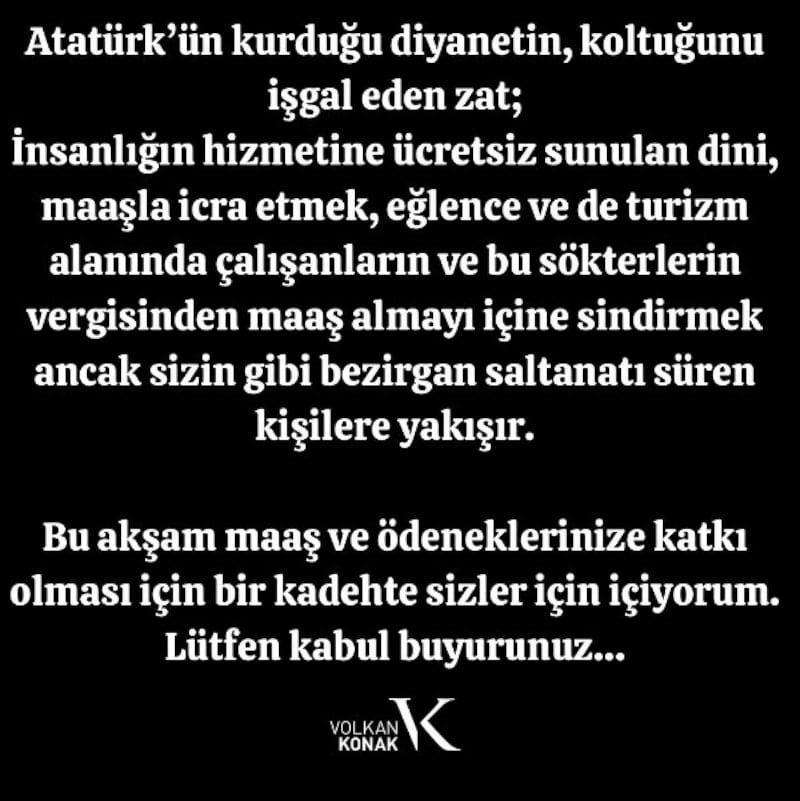 Atatürk’ün kurduğu diyanetin koltuğunu işgal eden zat; insanlığın hizmetine ücretsiz sunulan dini, maaşla icra etmek, eğlence ve de turizm alanında çalışan ve bu sekterlerin vergisinden maaş almayı içine sindirmek ancak sizin gibi bezirgan saltanatı süren kişilere yakışır.