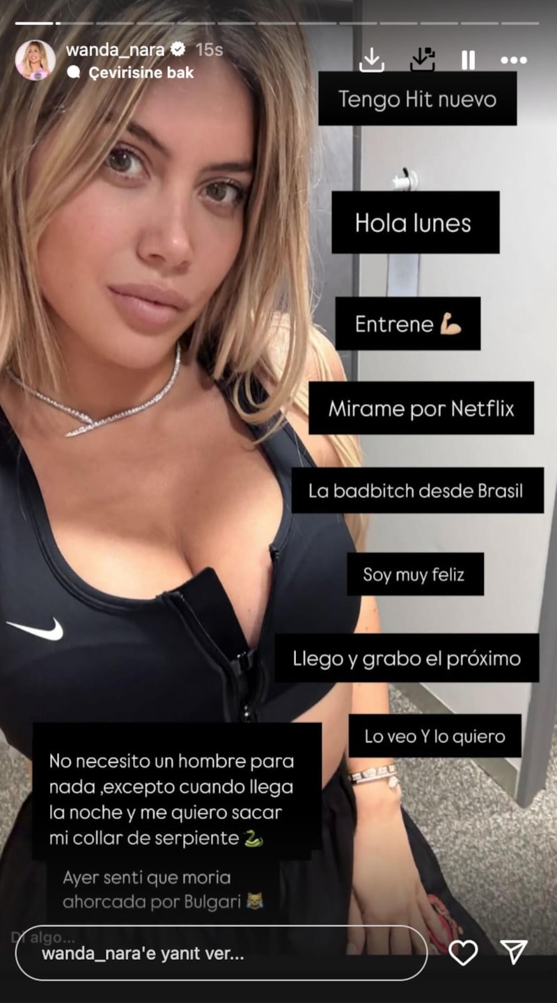 Brezilya'da olduğunu dile getiren Wanda Nara, bir fotoğrafını paylaşarak şu notu düştü; "Yeni bir hit'im var! Merhaba Pazartesi... Pazartesi günü antrenman yaptım, beni izleyin. Brezilya'da kötü kız olarak çok mutluyum; geliyorum ve bir sonrakini çekiyorum. Gece olduğunda ve yılan kolyemi çıkarmak istediğim zamanlar dışında hiçbir şey için bir erkeğe ihtiyacım yok."