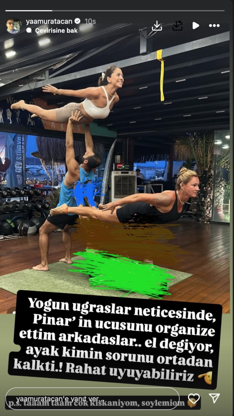 Atacan, şimdi de eşinin yeni yoga pozlarını paylaştı. Sosyal medyadaki yorumları ti'ye alan Yağmur Atacan, karısını kaldıran kişiyi fotoğrafta karalayarak "Yoğun uğraşlar neticesinde Pınar'ın uçuşunu organize ettim." dedi.