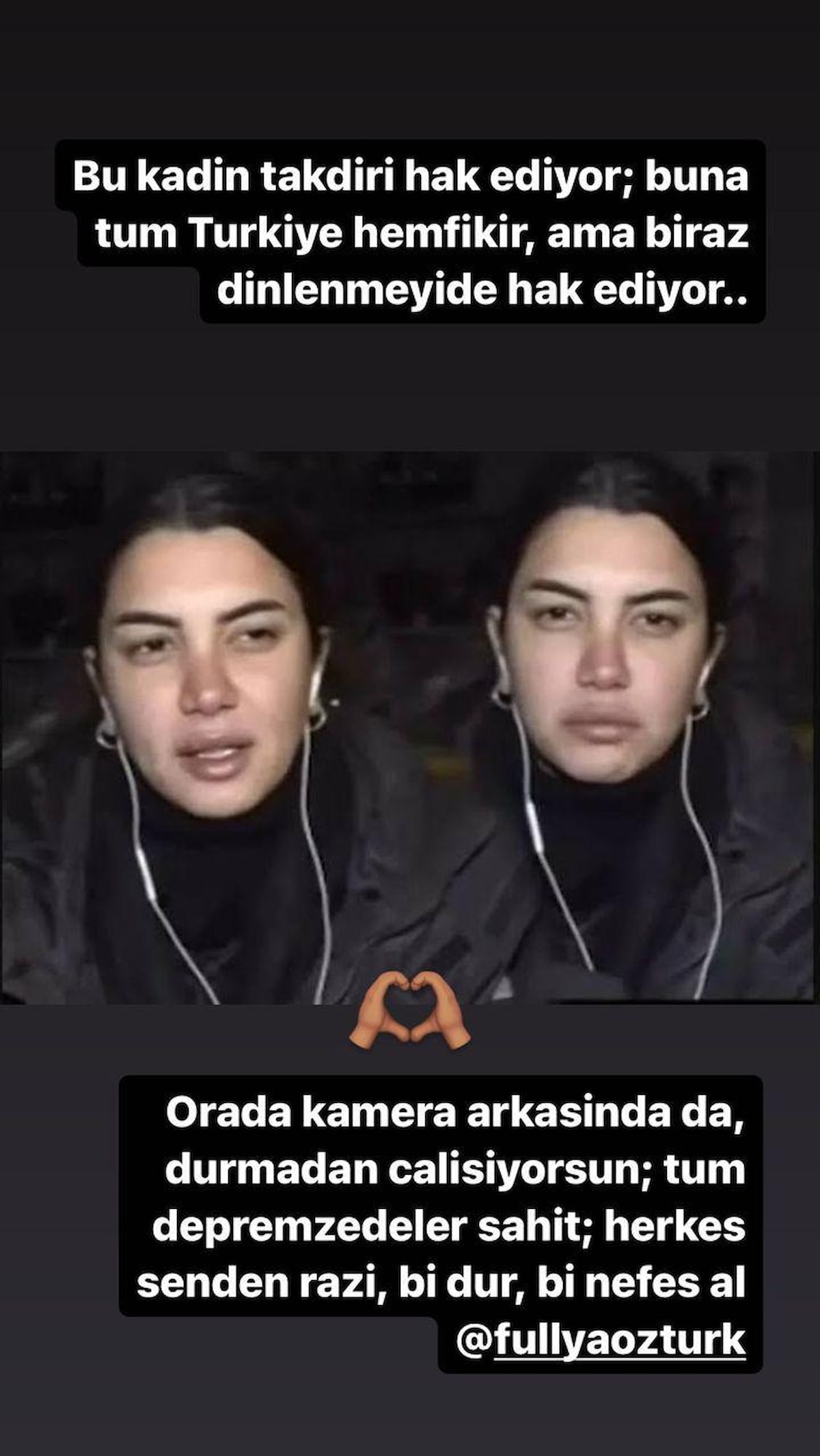 "Buna tüm Türkiye hemfikir, ama biraz dinlenmeyi de hak ediyor. Orada kamera arkasında da, durmadan çalışıyorsun; tüm depremzedeler şahit; herkes senden razı, bi' dur, bi' nefes al."