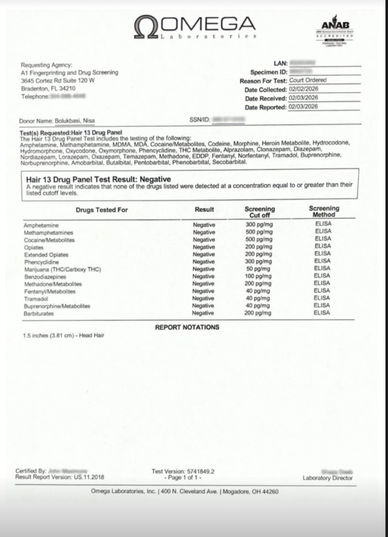 Bir süredir Amerika Birleşik Devletleri'nde yaşamını sürdüren müvekkilimiz, vatandaşlık prosedürleri sebebiyle yakın tarihte ülkemize seyahat edemeyecekse de; 02/02/2026 tarihinde ABD'de akredite bir laboratuvarda saç örneğinden 13 panel uyuşturucu/uyarıcı madde tarama testi yaptırmış olup, 03/02/2026 tarihli raporda tüm sonuçların negatif olduğu tespit edilmiştir.