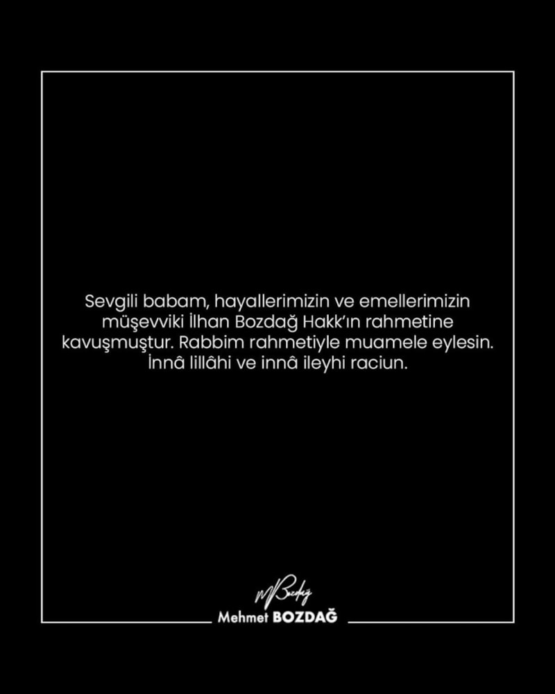 Bozdağ açıklamasında, "Sevgili babam, hayallerimizin ve emellerimizin müşevviki İlhan Bozdağ, Hakk’ın rahmetine kavuşmuştur. Rabbim rahmetiyle muamele eylesin. İnna lillahi ve inna ileyhi raciun." dedi.