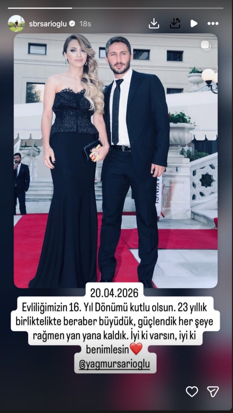 Haklarında bir süredir devam eden boşanma iddiasına sessiz kalan Sabri Sarıoğlu, evliliğinin 16. yılını kutladı. Sosyal medya hesabından eşiyle bir karesini yayınlayan Sarıoğlu, şu notu düştü: "20.04.2026... Evliliğimizin 16. yıl dönümü kutlu olsun. 23 yıllık birliktelikte beraber büyüdük, güçlendik her şeye rağmen yan yana kaldık. İyi ki varsın, iyi ki benimlesin."