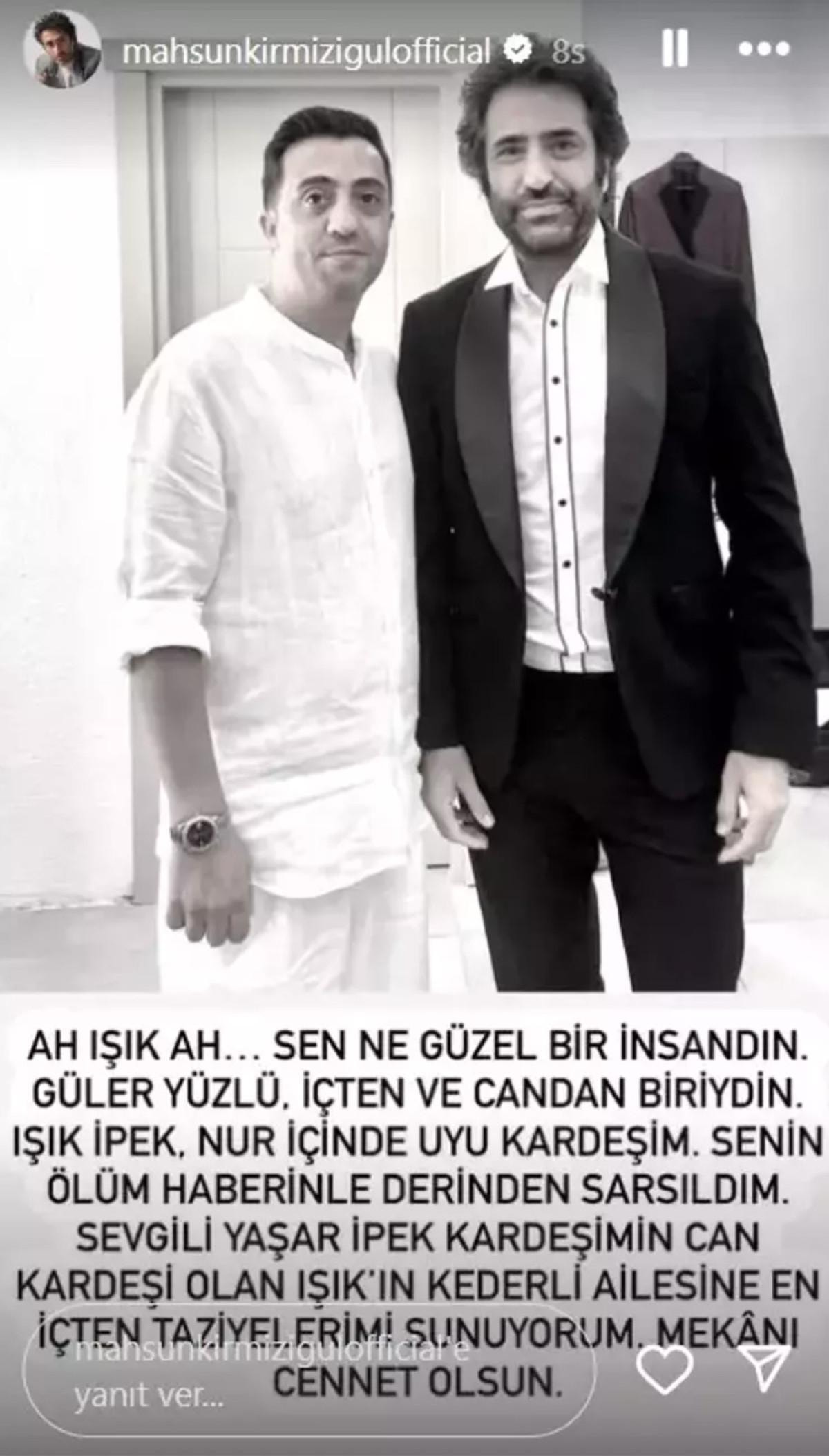 Işık İpek'in vefatıyla ilgili ünlü isimleri de paylaşım yaptı. İpek ile bir fotoğrafını paylaşan Mahsun Kırmızıgül, "Ah Işık ah... Sen ne güzel bir insandın. Güler yüzlü, içten ve candan biriydin. Nur içinde uyu kardeşim. Senin ölüm haberinle derinden sarsıldım. Sevgili Yaşar İpek kardeşimin can kardeşi olan Işık'ın kederli ailesine en içten taziyelerimi sunuyorum. Mekanı cennet olsun." dedi.