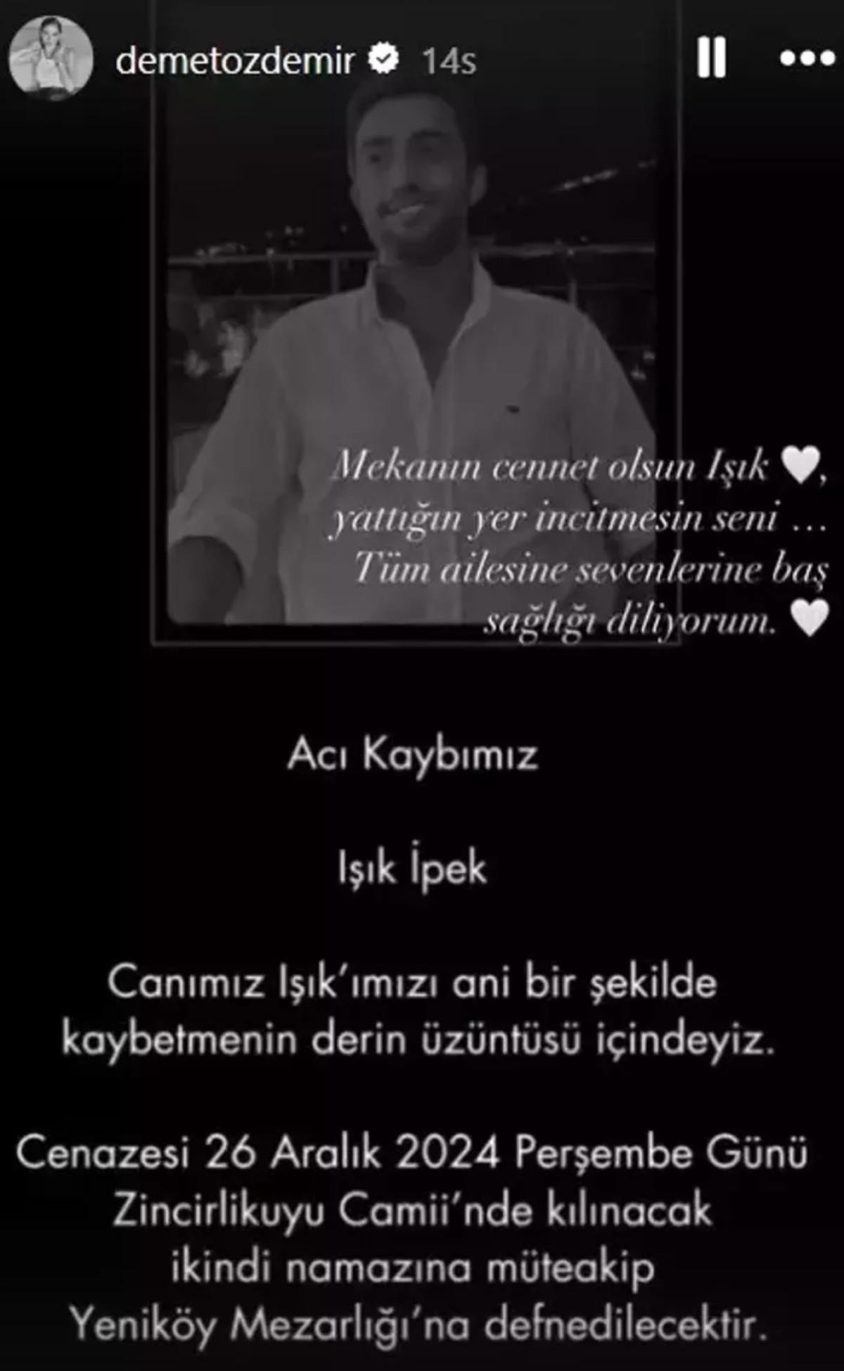 Güzel oyuncu Demet Özdemir, paylaşımında "Mekanın cennet olsun Işık. Yattığın yer incitmesin seni. Tüm ailesine ve sevenlerine başsağlığı diliyorum." ifadelerini kullandı.