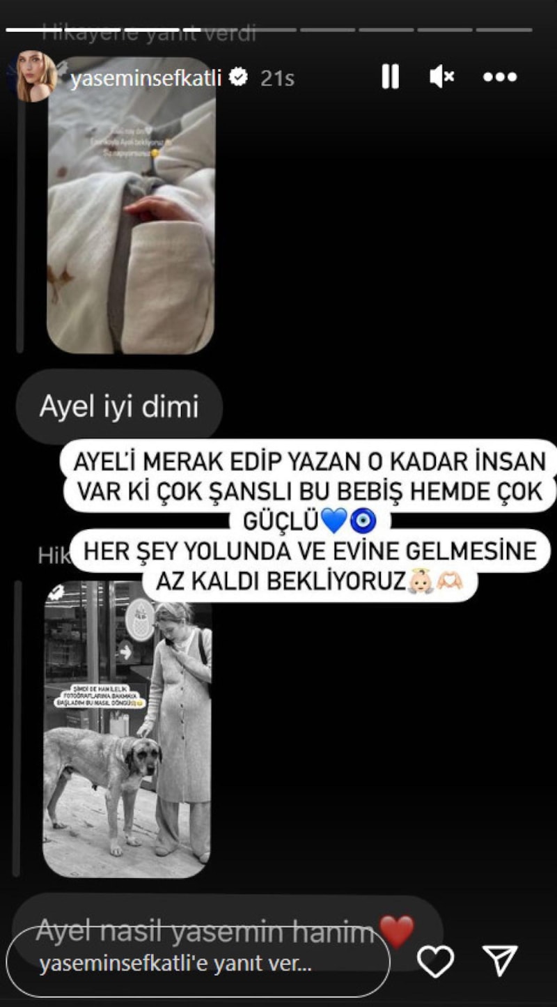 Şefkatli daha sonra ise bebeğinin durumunu soranlara cevap verdi. Güzel isim paylaşımına, "Ayel'i merak edip yazan çok kişi var. Çok şanslı bu bebiş hem de çok güçlü. Her şey yolunda ve evine gelmesine az kaldı" dedi.