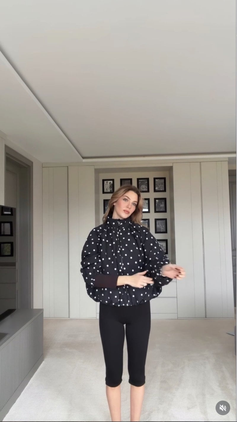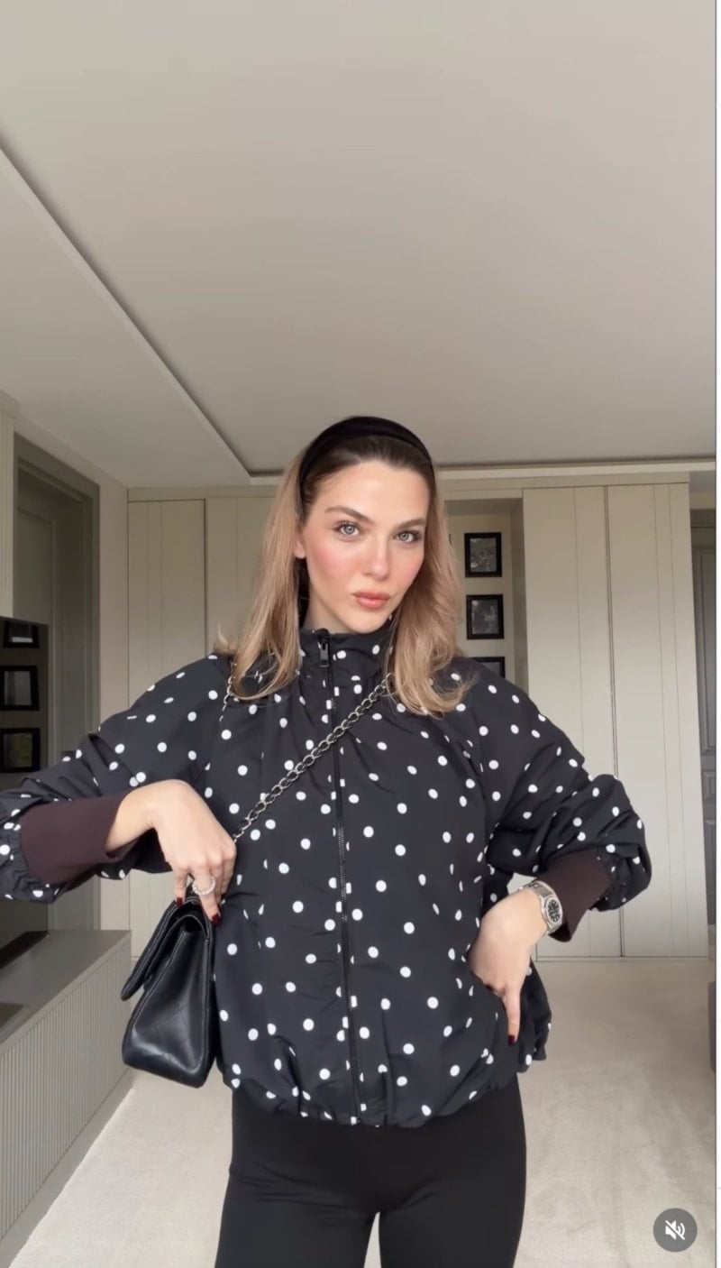 Puantiyeli montu içerisine tercih ettiği kahverengi bluz ve kapri taytıyla kısa sürede takipçilerinden tam not aldı.