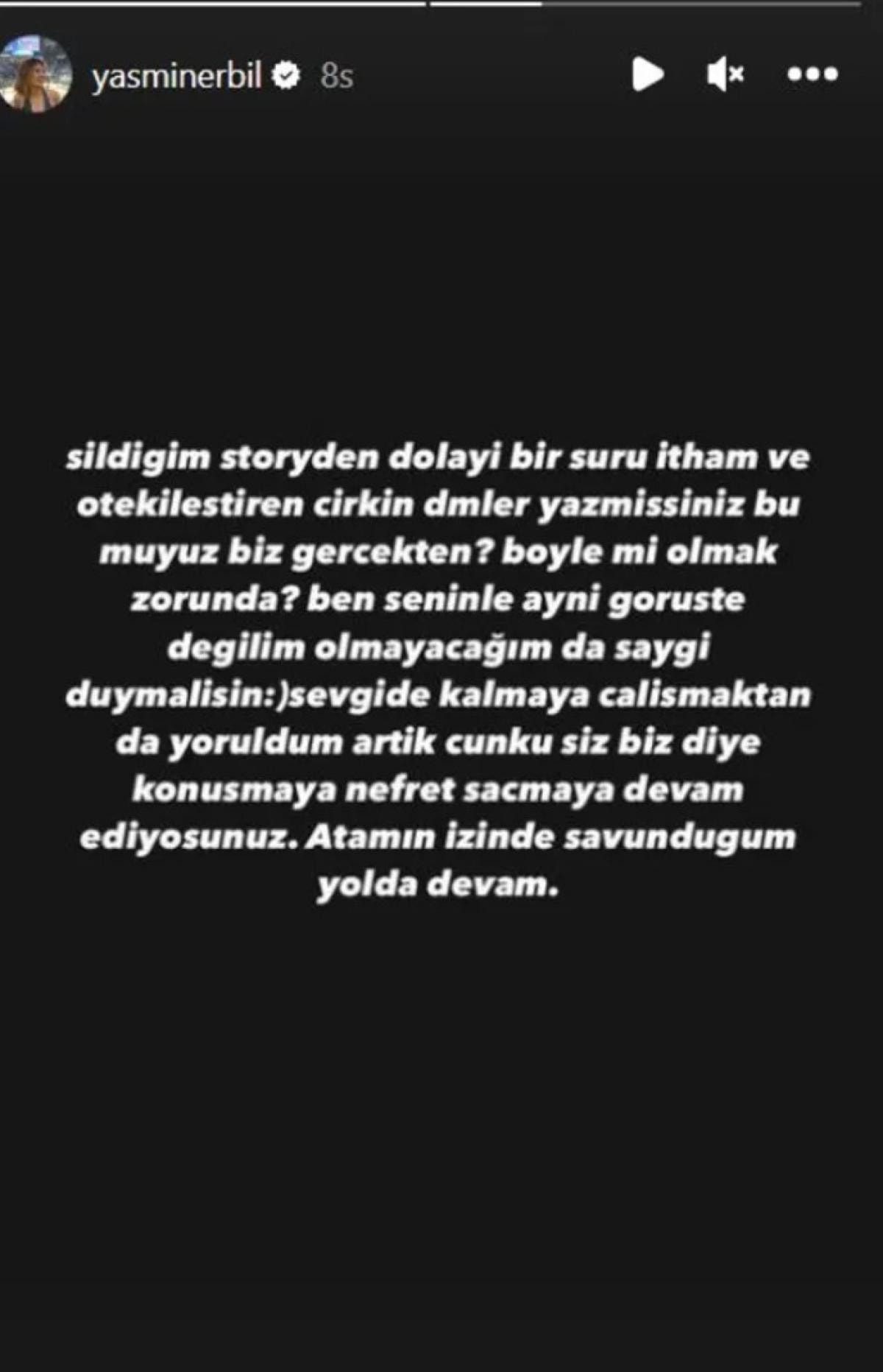 Yasmin Erbil, "Sildiğim storyden dolayı bir sürü itham ve ötekileştiren çirkin dm'ler yazmışsınız bu muyuz biz gerçekten? Böyle mi olmak zorunda? Ben seninle aynı görüşte değilim olmayacağım da saygı duymalısın. Sevgide kalmaya çalışmaktan yoruldum artık çünkü siz diye konuşmaya nefret saçmaya devam ediyorsunuz. Atam'ın izinde savunduğum yolda devam." dedi.