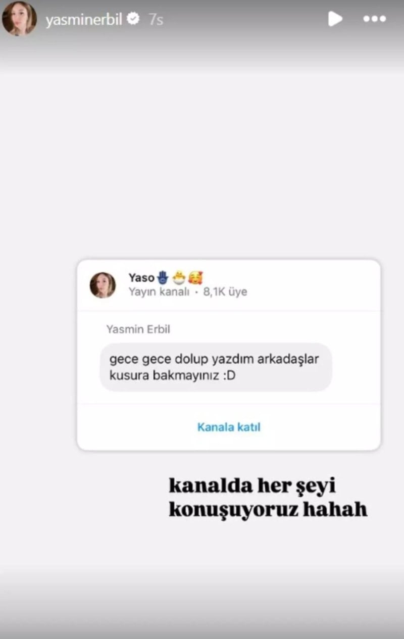 Mehmet Ali Erbil'in kızı Yasmin Erbil, 'TiKTok'ta gece gece birisi şöyle yazmış; izlemiyorsun işte Yiğit'i samimiyetsizsin bilmem ne. Arkadaşlar her saniye bunu paylaşmak istemediğim olabilir mi? Benim de işlerimin olduğu veya arkadaşlarımı görmem gereken, ailemle vakit geçirmem gereken günler olabilir değil mi? Sonrasında yine kaçırdığım bölümü açıyorum. Bunun açıklamasını yaptığıma inanamıyorum.' ifadelerini kullandı.