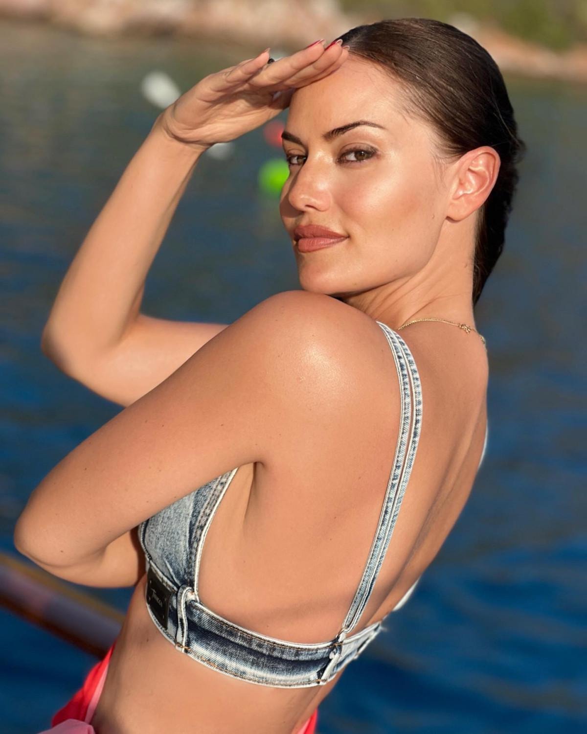 Son paylaşımıyla tüm dikkatleri üzerine çeken Evcen, kot büstiyeriyle teknede pozlar verdi.
