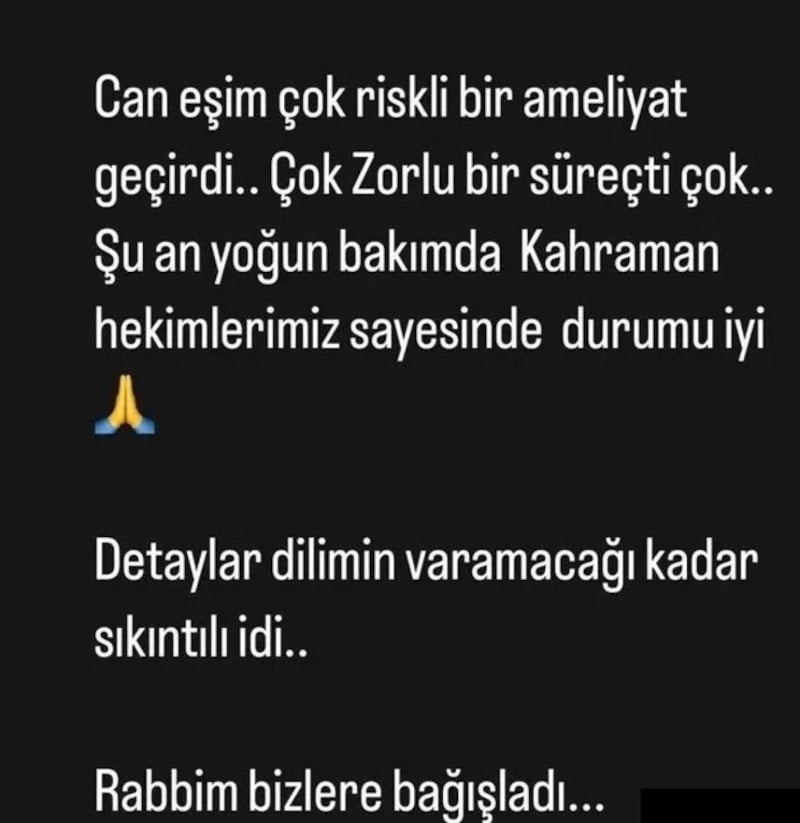 Can eşim çok riskli bir ameliyat geçirdi. Çok zorlu bir süreçti çok. Şu an yoğun bakımda. Kahraman hekimlerimiz sayesinde durumu iyi. Detaylar dilimin varamayacağı kadar sıkıntılıydı. Rabbim bizlere bağışladı.