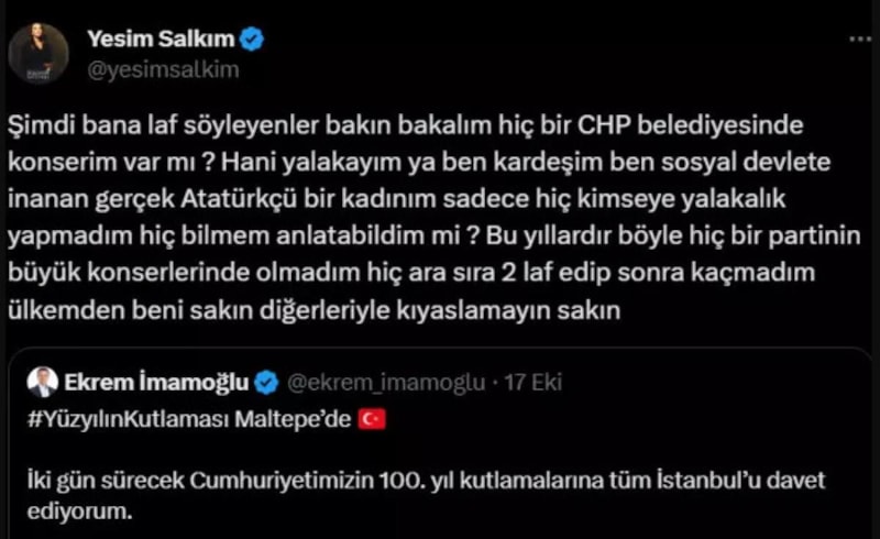"Şimdi bana laf söyleyenler bakın bakalım hiçbir CHP belediyesinde konserim var mı?" diyerek isyan eden Salkım, paylaşımın devamında şunları söyledi: "Hani yalakayım ya ben kardeşim ben sosyal devlete inanan gerçek Atatürkçü bir kadınım sadece, hiç kimseye yalakalık yapmadım hiç bilmem anlatabildim mi?