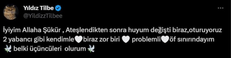 Daha sonra sosyal medya hesabından açıklama yapan Tilbe, "İyiyim Allah'a Şükür. Ateşlendikten sonra huyum değişti biraz, oturuyoruz 2 yabancı gibi kendimle.