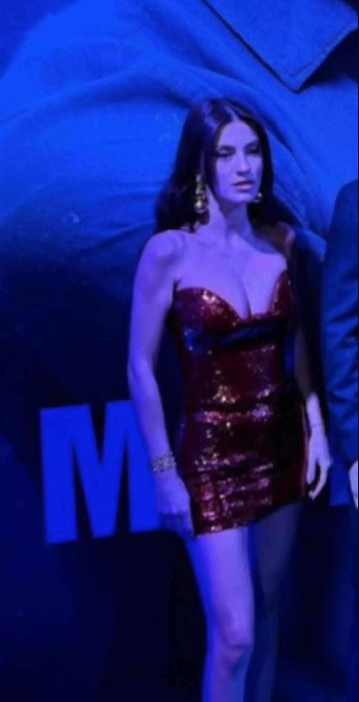 Filmin galasına süper mini kırmızı ve payetli elbisesi ile katılan Yüsra Geyik, kombinini büyük küpeleri ve siyah ayakkabılarıyla tamamladı.