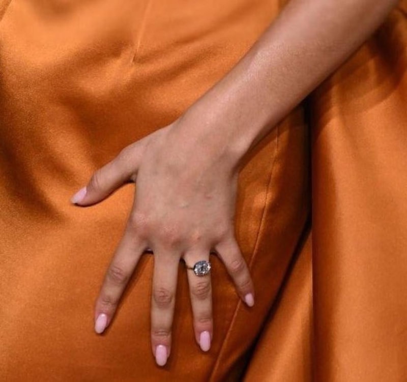 Dünyaca ünlü bir markanın tasarım elbisesi elbisesi ve yeni bob saç modeli kesinlikle dikkatleri üzerine çekerken, herkesin konuşmasını sağlayan şey ise sol elindeki göz kamaştırıcı yüzüğüydü.