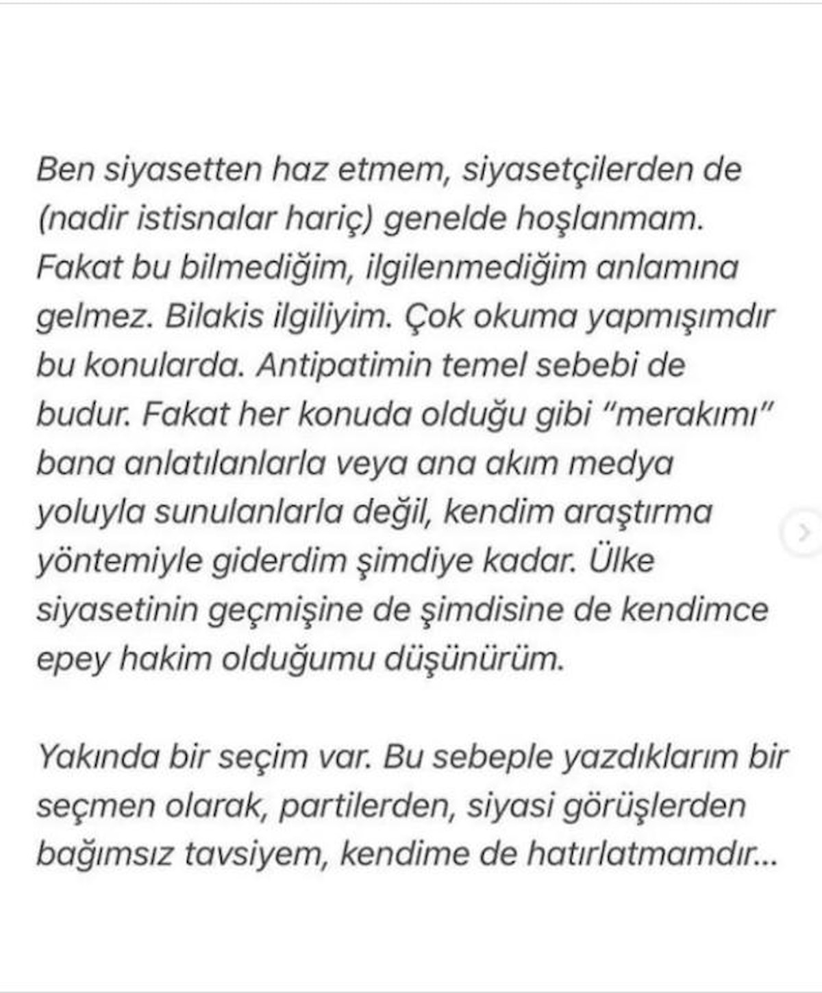 "Burayı eğlence amaçlı kullanılan bir platform olarak gördüm hep (ki öyle), hiç ciddiye almadım hep küçümsedim. Ta ki 6 Şubat'a kadar. O kadar çok insana dokunabildim, fayda sağlayabildim ki buradan, ben bile şaşırdım. Bu yüzden bir kişiye bile dokunsam benim için kârdır. Dil sevgi olsun, kalem barış…" diyerek uzun uzun düşüncelerini paylaşan Zeynep Sever Demirel, seçime dair fikirlerini de dile getirdi:
