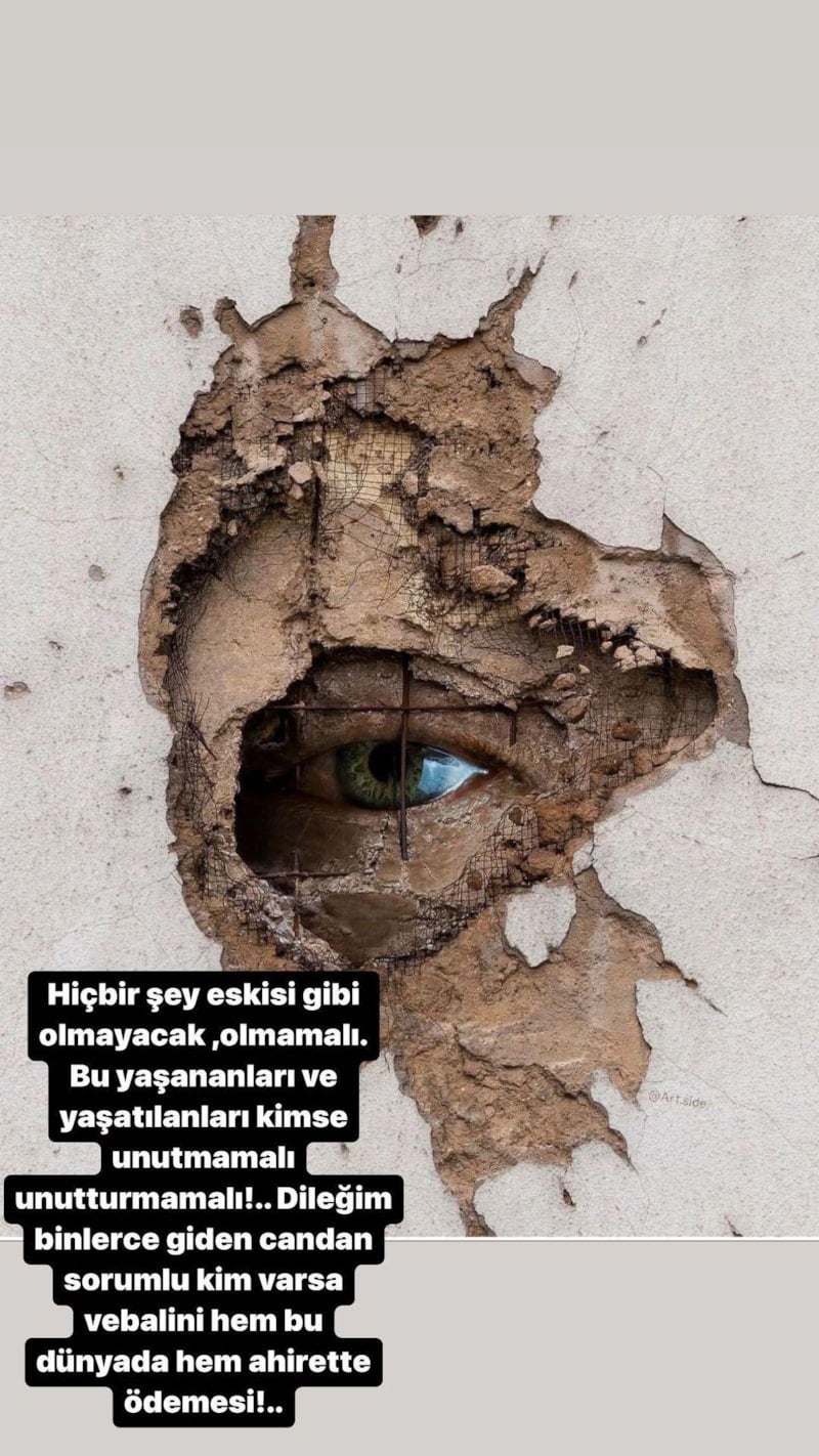 “Ancak bugün gelebilen kurtarma ekibi dayım ve kuzenimin cansız bedenlerine ulaşmışlar. Acıma öfkem, yasıma geride kalanlar için umudum karıştı. Allah’ım yaşam savaşı verenlerini kurtulan tüm vatandaşlarımızın ve canla başla çalışan tüm ekiplerin yardımcısı olsun. Arayan soran herkese teşekkür ederim. Dualarım ülkem için. Hepimizin başı sağ olsun.