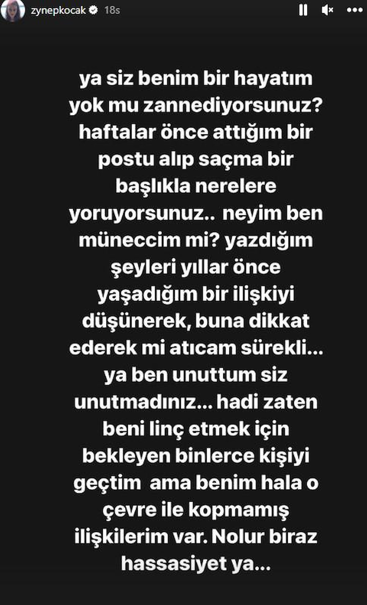 Bu sebeple gündem olan oyuncu isyan etti. Zeynep Koçak şöyle dedi: "Ya siz benim bir hayatım yok mu zannediyorsunuz? Yazdığım şeyleri yıllar önce yaşadığım bir ilişkiyi düşünerek buna dikkat ederek mi atacağım sürekli..."