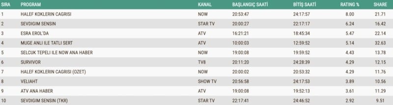 Dün akşam reyting sıralamasında her hafta olduğu gibi Halef: Köklerin Çağrısı dizisi zirvede yer aldı.